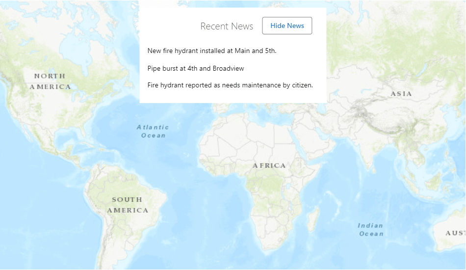 This React component displays a list of "news items" relevant to your GIS application in a hovering component at the top of the map. In a real application, these news items would be populated by an RSS feed or another news source.